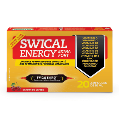 La formule Swical Energy est une combinaison de 6 vitamines du groupe B, de fer et d’extraits de plantes (spiruline, ginseng, échinacée, fenugrec, ginko biloba). Cette formule complète au goût de cerise permet d’avoir l’énergie nécessaire pour passer à travers la journée.